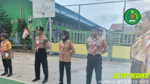 Hulu Sungai Selatan (MTsN 10 HSS) – Prestasi membanggakan kembali ditorehkan oleh peserta didik Madrasah Tsanawiyah Negeri 10 Hulu Sungai Selatan, Arif Rahman Hakim. Ia sukses menjalankan tugas mulianya sebagai pengibar bendera dalam gelaran kegiatan Gelar Senja yang diselenggarakan oleh Kwartir Ranting (Kwarran) Pramuka Daha Utara, Sabtu (21/06/2025) di Lapangan Sekolah Menengah Atas Negeri 1 Daha Utara (SMAN 1 Daha Utara).